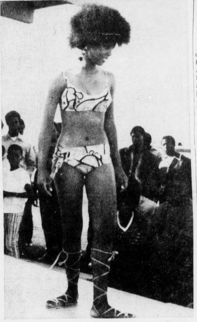Dianne Clipper, 18, knows what it feels like to take first place after winning the Afro fashion show at Sunday s Benefit Barbeque held by the Ad Hoc Community Action Group. The picnic was organized at Desert Highland Park in the North End to raise funds for a teen center for the youth of Palm Springs. In the other photograph some of the people who attended the picnic were Gene House, Palm Springs Community Relations Director (second from left) with his wife; Garbey Sanders, L.A. County Job Procurment Office representative (third from left) and Willie Mayfield of the Ad Hoc Committee and a member of the Palm Springs Human Relations Commission.